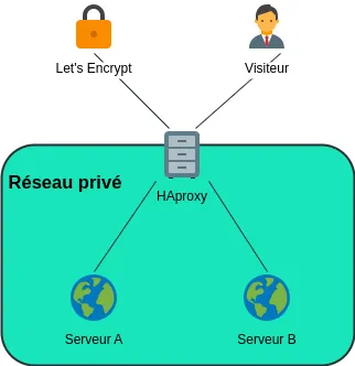 La gestion des certificats SSL (qui permet au HTTPS de chiffrer les communications) doit être faite par HAProxy. Parce que les serveurs web capables de répondre à un challenge ACME se trouvent ailleurs dans un réseau privé d’une part, et parce que dans un environnement de load balancing, c’est très important de maintenir une configuration homogène entre les différents serveurs. Donner plus de pouvoir à un des backends pour le renouvellement d’un certificat SSL romprait cette homogénéité. En plus, comme on redirige une requête sur deux vers chaque serveur, la génération de certificats SSL, nécessaire au HTTPS, pourrait poser problème. En effet, je suis incapable de prédire si les robots de validation de l’ACME vont visiter le bon serveur.